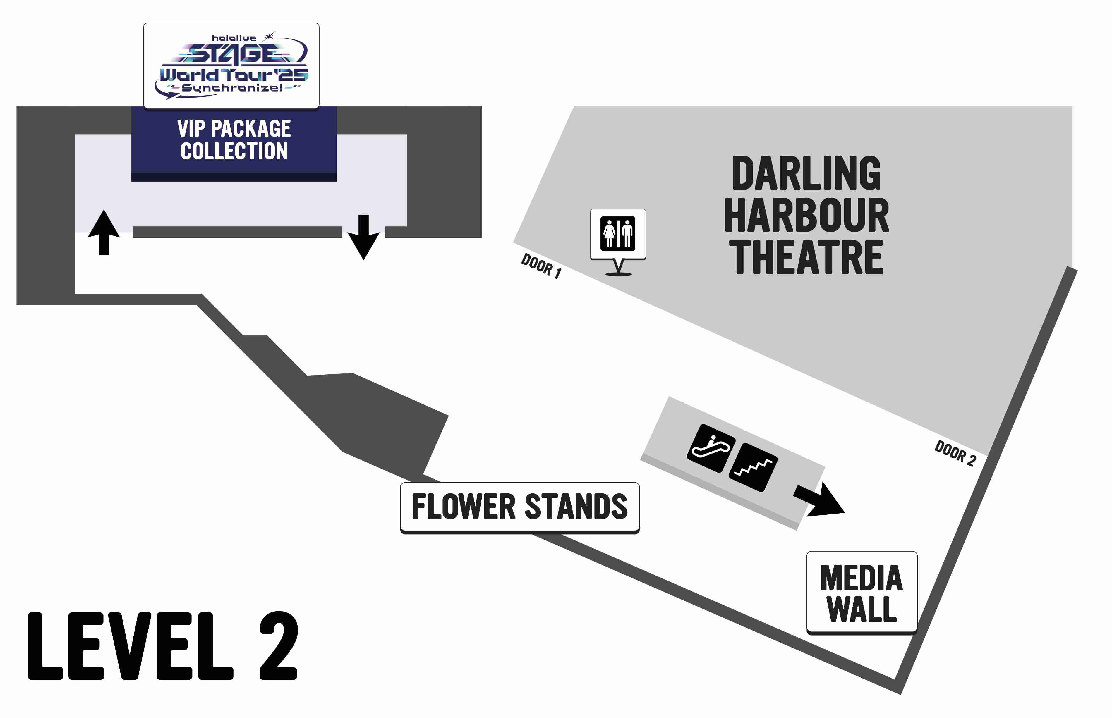 To access the collection point, you will first need to scan your ticket at level one of the convention centre to access the Level 2 concert area. The novelty item collection desk is located south of the escalators on Level 2.