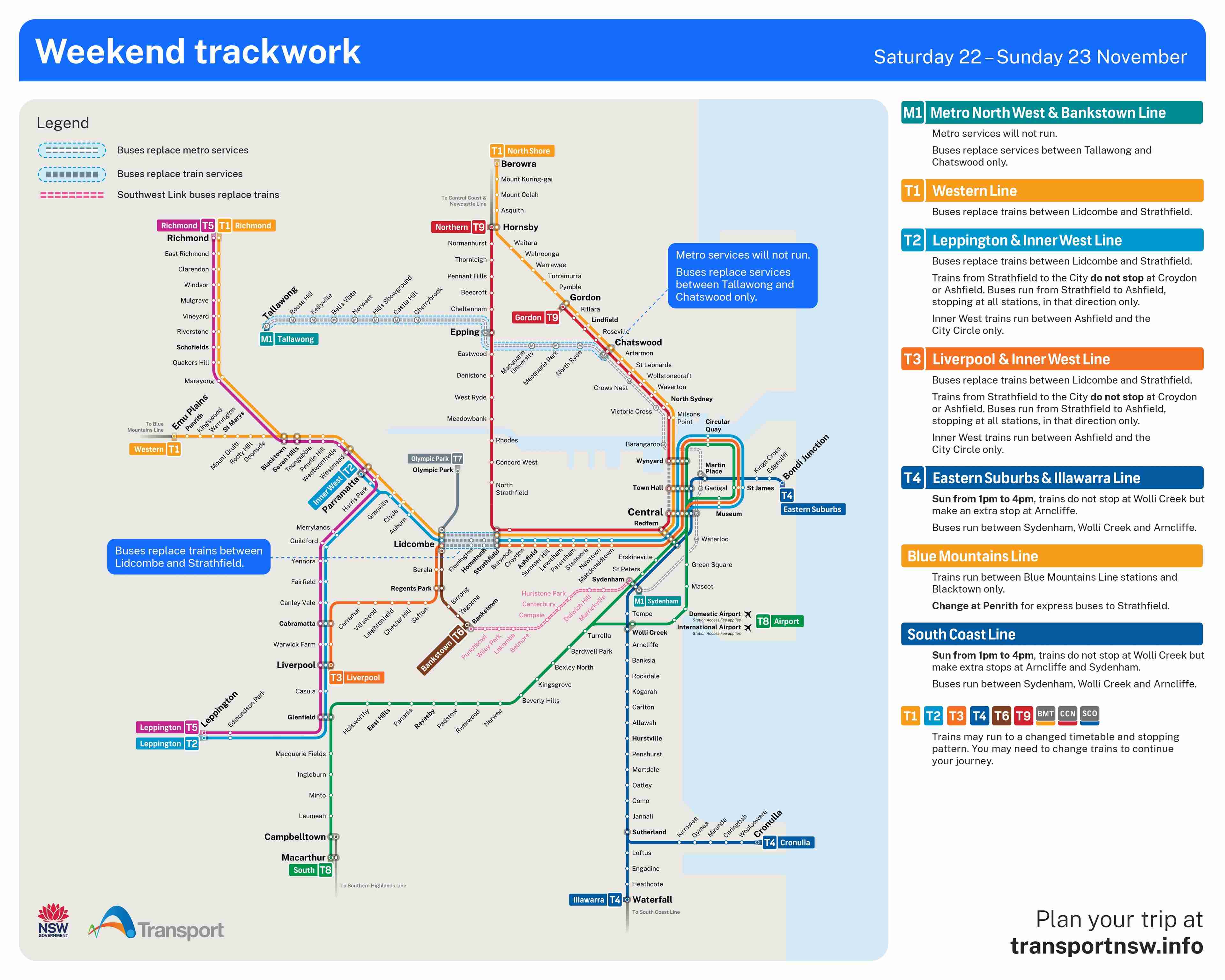 For more information please check out transportnsw.info for the latest info as to what's happening on our Sydney Train lines and roads!
